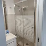 Badeværelse indeholder også badehånklæder, en hårtørrer og håndklæder med et bidet og en bruser.